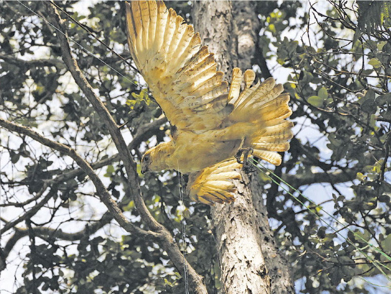 In Puerto Rico, trainers teach their release candidates to fear, avoid and hide from fierce red-tailed hawks. They employ a number of techniques, including playing hawk shrieks while the predator’s silhouette passes overhead and staging simulated attacks by a trained hawk in full view of the parrots.