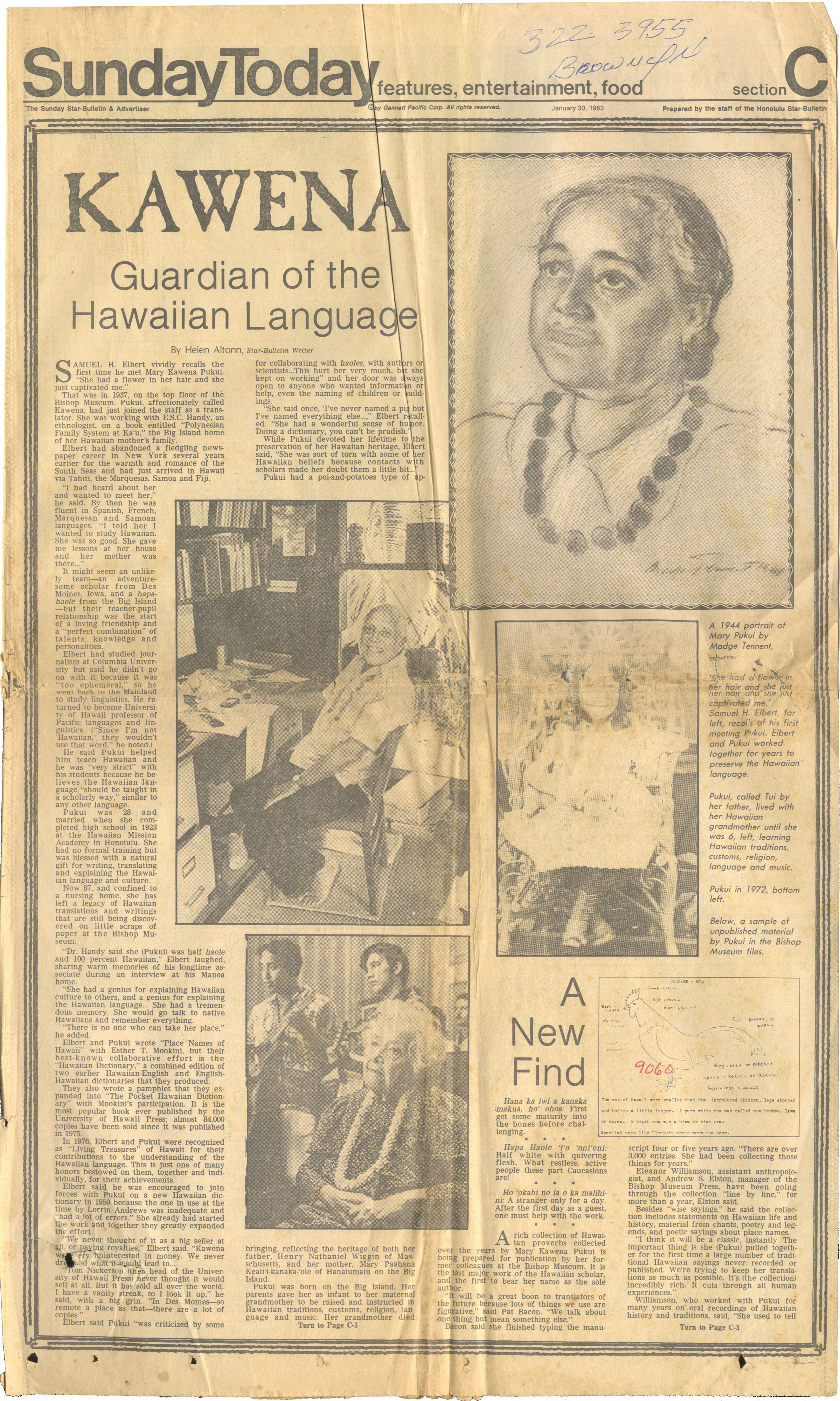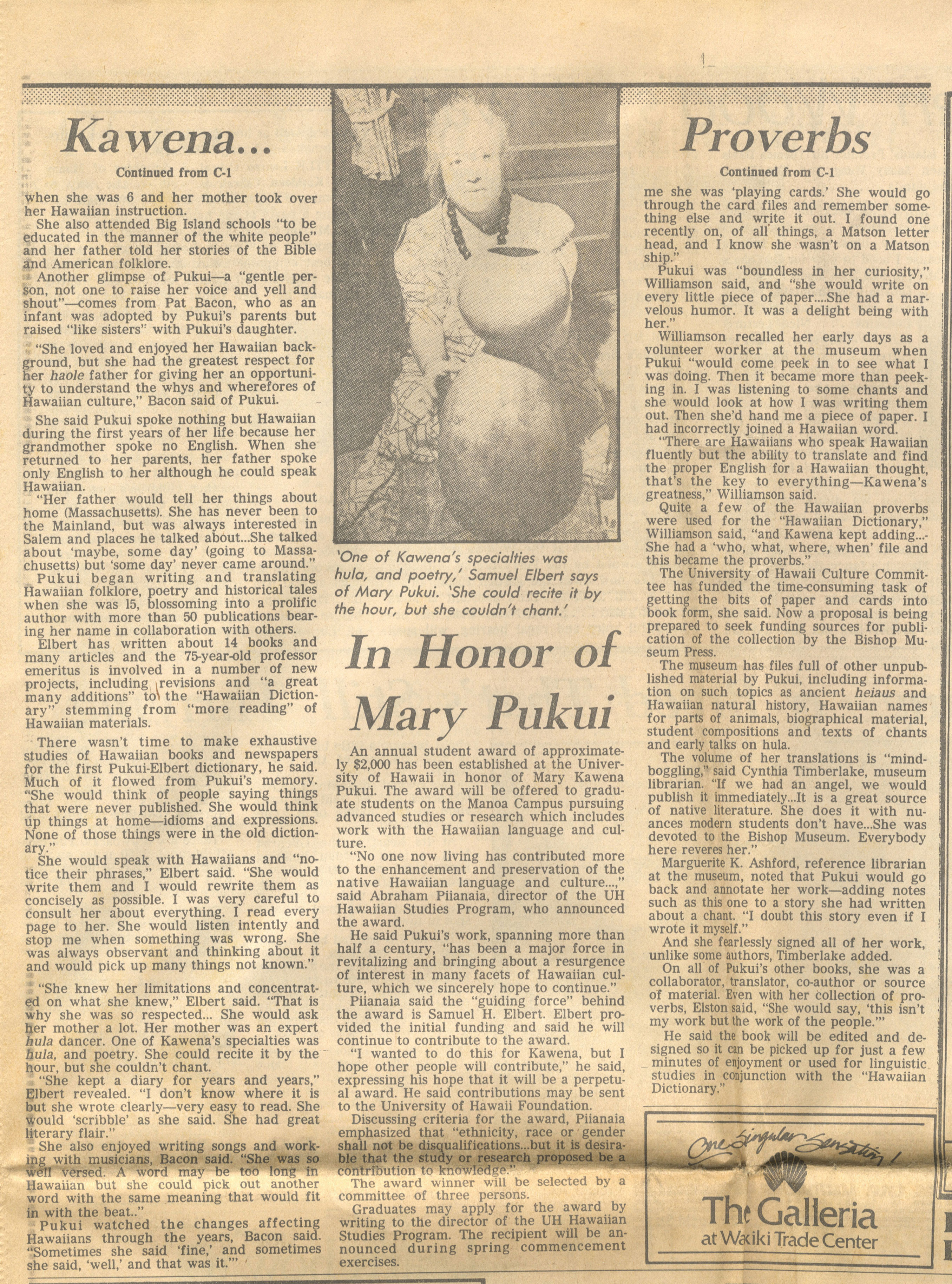 He said Pukui's work, spanning more than half a century, "has been a major force in revitalizing and bringing about a resurgence of interest in many facets of Hawaiian culture, which we sincerely hope to continue."